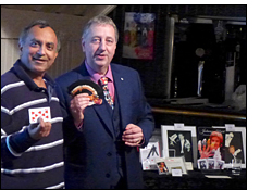 Photo: Steve Short shows Ajay Vora a trick with Johnny Hart Playing cards.